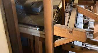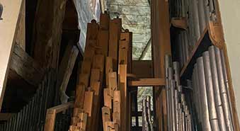 Martin Lodahl und sein Kollege Thomas Filter tragen die Pfeifen der Orgel nacheinander in den Kirchenraum. Dort stehen schon mehrere Pfeifen aus Holz, auf den Bänken liegen welche aus Metall. Insgesamt werden um die 600 Orgelpfeifen von den beiden Orgelbauern aus der Orgel der Berger Kirche ausgebaut. Dort hat am Montag die Sanierung des Instruments,