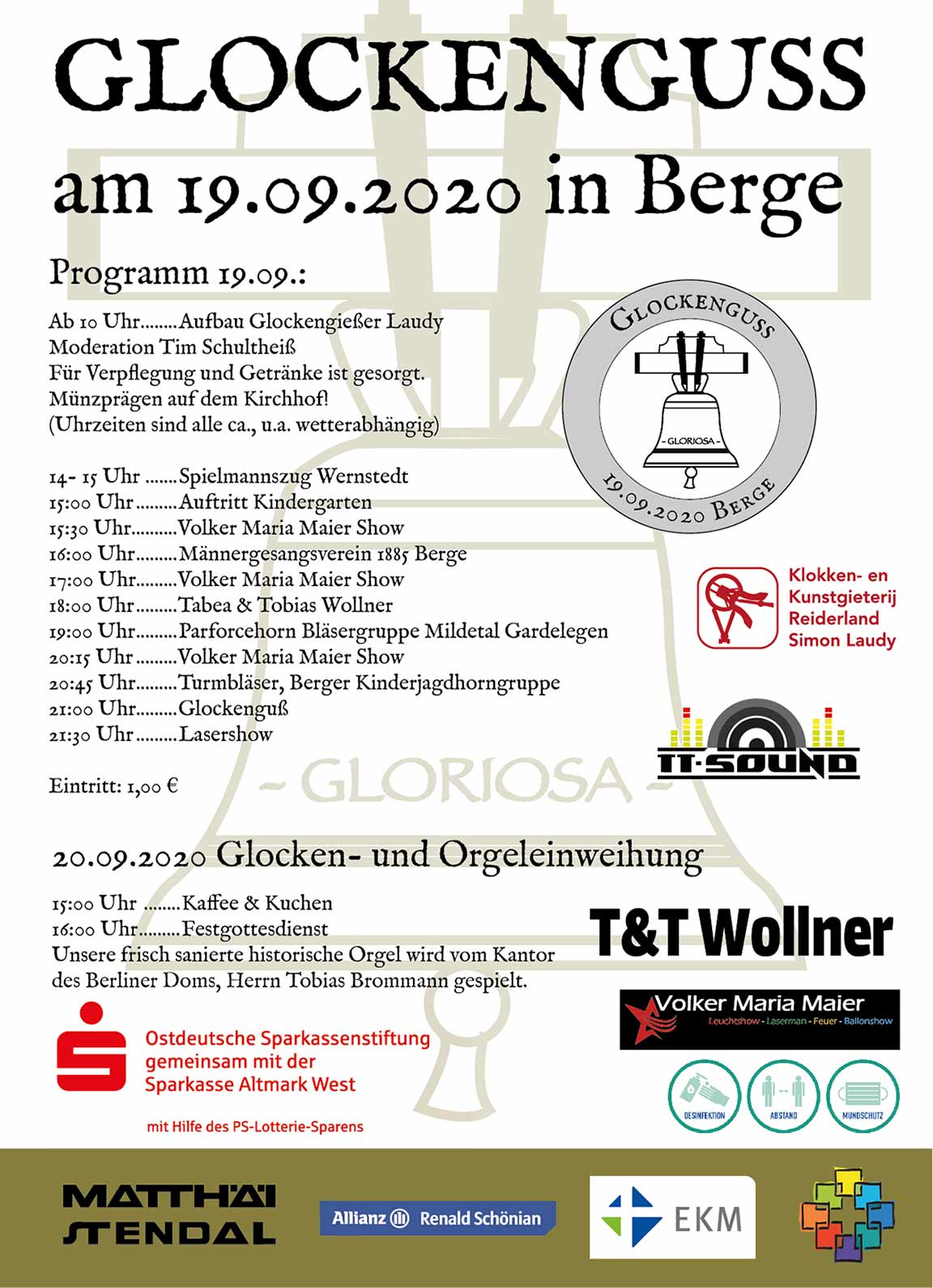 Am 19. September 2020 wurde direkt auf dem Kirchhof der Dorfkirche Berge bei strahlendem Sonnenschein die Glocke "Gloriosa" gegossen. Wir bedanken uns noch einmal bei allen Spendern und Mithelfenden (und bei Petrus), ohne die eine solche Veranstaltung nicht möglich gewesen wäre. Am Sonntag, den 20. September wurde die Glocke gemeinsam mit der frisch restaurierten Orgel eingeweiht.